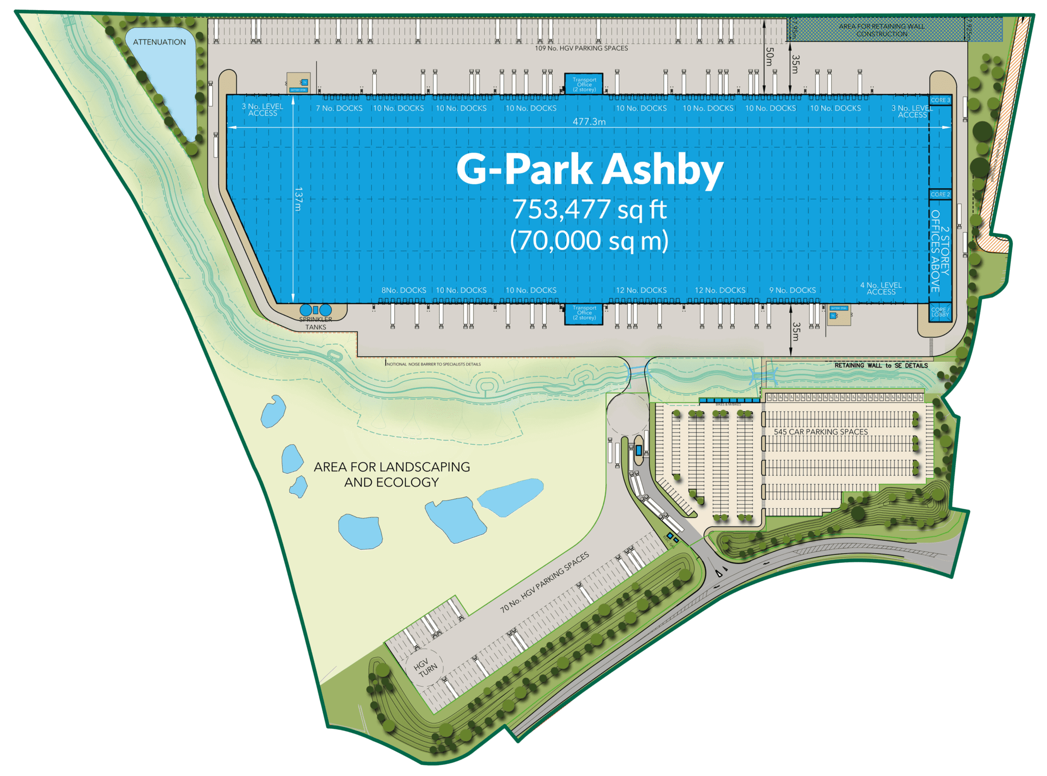 Units will be built to GLP’s enhanced specification, including 18m clear internal height, enabling higher racking systems and up to 30% more pallet positions. This maximises storage capacity, improves picking efficiency, and supports future operational growth. G-Park Ashby is a flexible logistics industrial development designed for performance and adaptability.