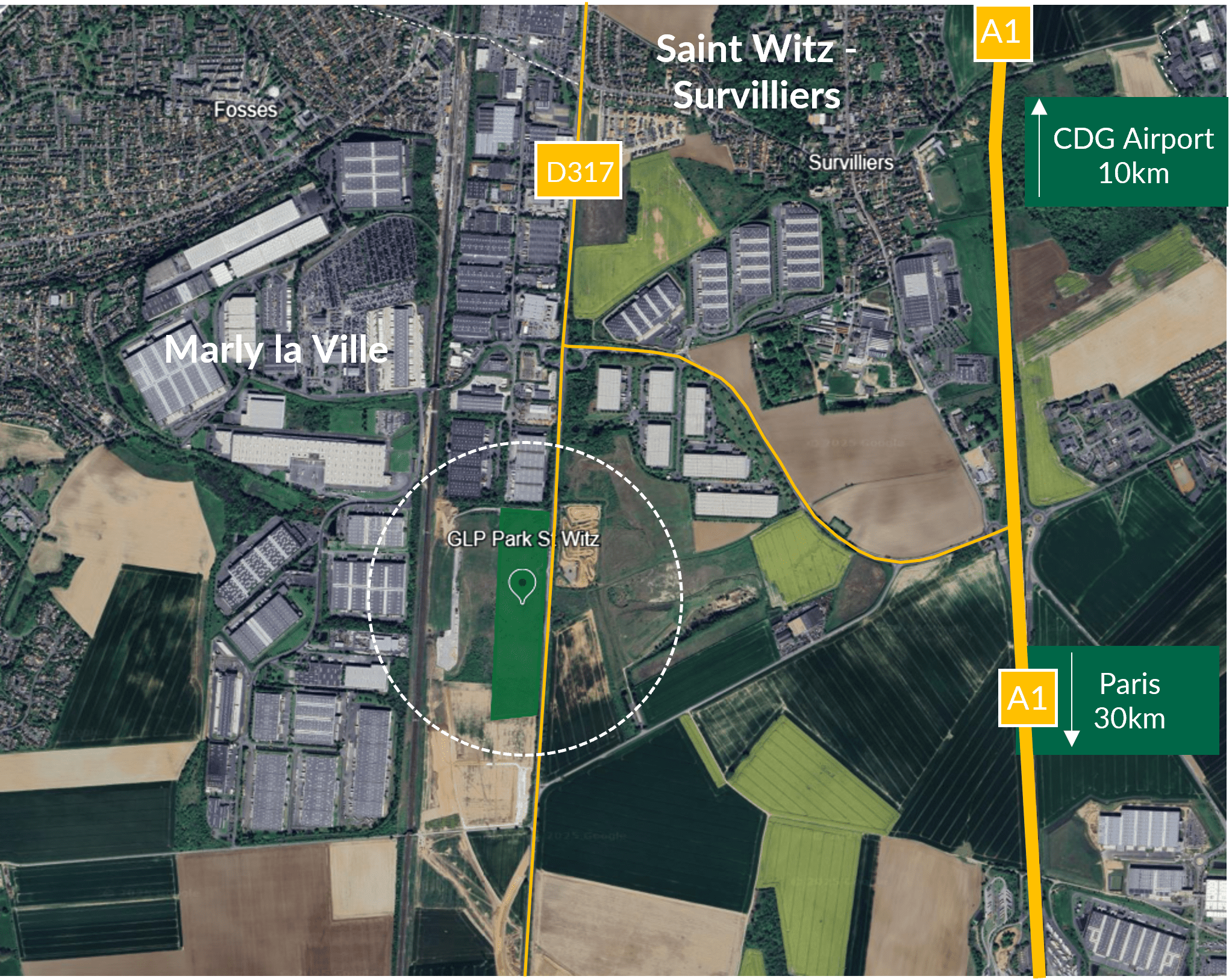 A few kilometers north of Paris, GLP Park Saint-Witz enjoys a premium location at the heart of a highly efficient transport network. Its immediate proximity to the A1 highway, the main axis connecting Paris to Lille and Northern Europe, ensures direct access to key consumer markets in the Île-de-France region and surrounding areas.