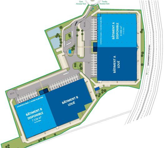Le parc propose deux bâtiments logistiques modernes totalisant 16 353 m², disponibles dès janvier 2026. Le Bâtiment 1 offre 8 088 m² (7 754 m² d’entrepôt, 304 m² de bureaux, 30 m² de locaux techniques). Le Bâtiment 2 offre 7 455 m² (7 118 m² d’entrepôt, 310 m² de bureaux, 27 m² de locaux techniques).