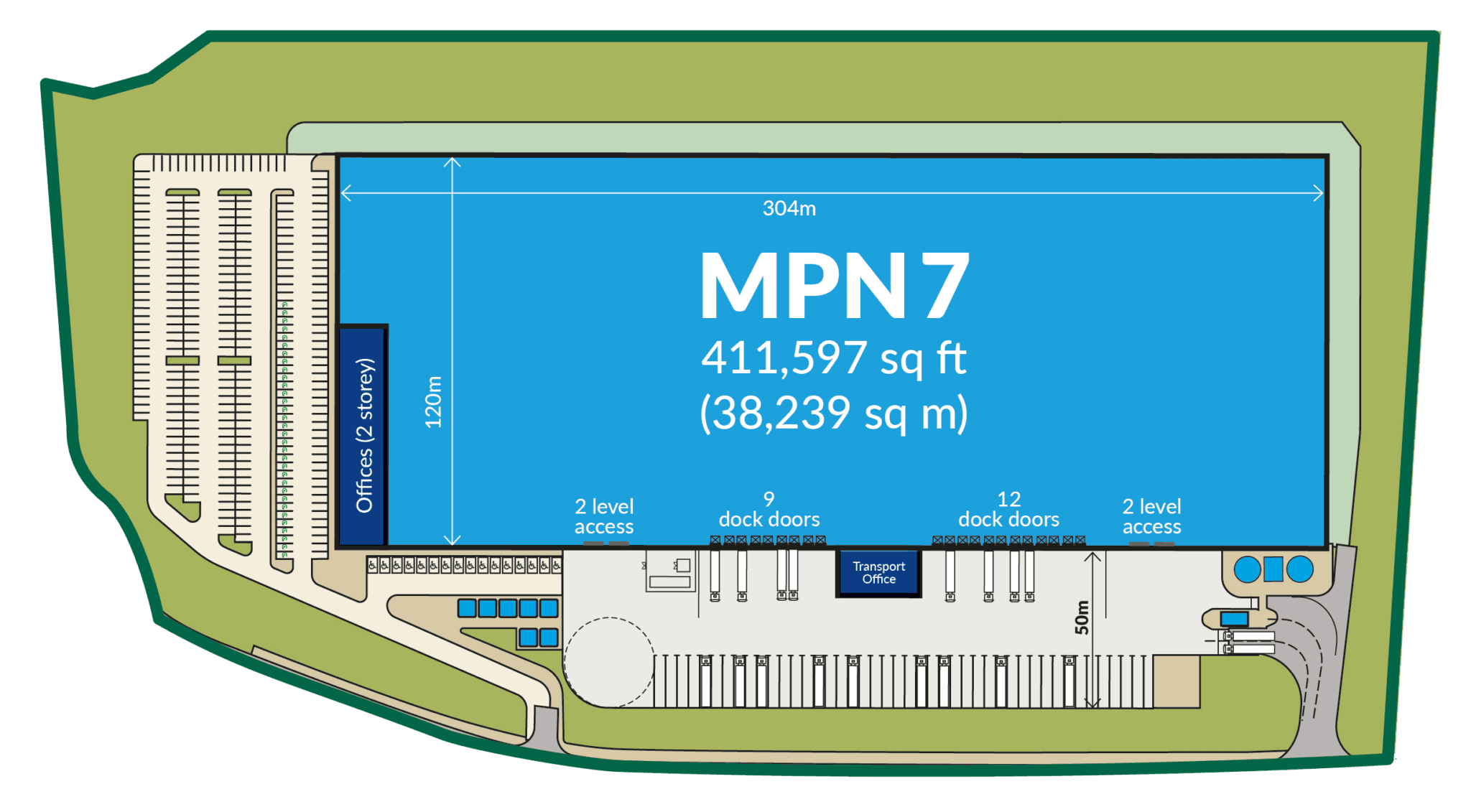 MPN 7 is designed for operational efficiency, with generous yard depths, 15m clear internal height, multiple dock and level access doors, and extensive HGV and car parking. The unit supports merchandise warehouse operations and logistics industrial development, offering flexibility for occupiers with complex supply chain needs. Located within a thriving logistics park, it benefits from shared infrastructure and proximity to major transport routes, making it ideal for commercial warehouses and industrial development.
