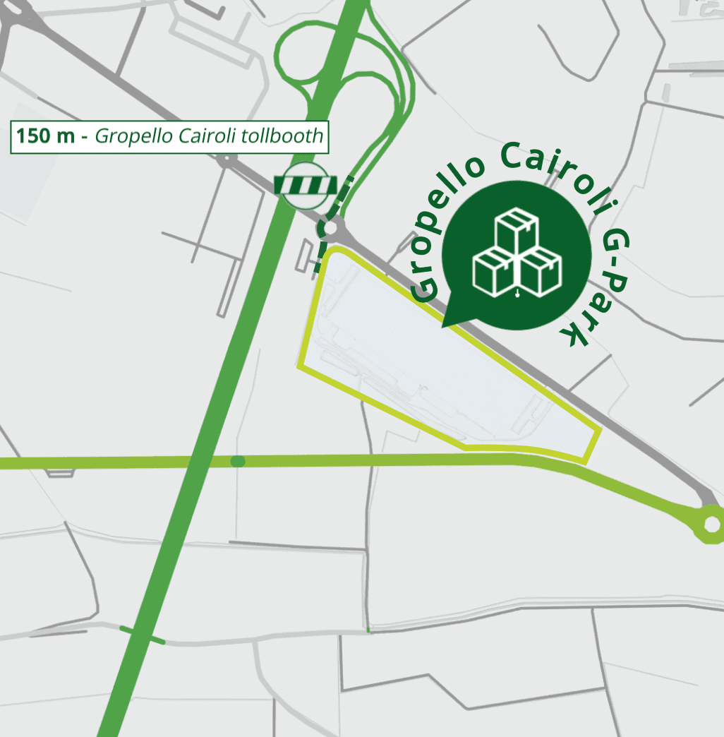 G-PARK Gropello Cairoli is located in a strategic position, right in front of the Gropello Cairoli exit of the A7 motorway, which allows you to reach Milan in a very short time, but also connects the area to Genoa and Turin. Its location, close to the Milan macro-area, makes this warehouse a unique opportunity. Milan Linate airport is about 50 km away, and Milan Malpensa airport about 70 km. The port of Genoa is approximately 100 km away, while Turin airport is approximately 170 km away. The convenient access to the motorway axis and the proximity to the Lombard capital allow easy access to the entire western area of northern Italy.